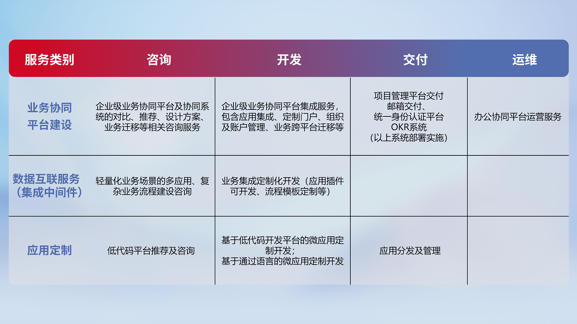 针对钉钉、、、企微、、、IDaas等平台级产品提供产品的规划、、方案、、、交付、、、定制化开发等服务,,实现如统一协同办公、、、、智能客户服务、、、、混合会议管理、、智能数据查询、、、等业务场景,,,,实现数字化转型。。。。
